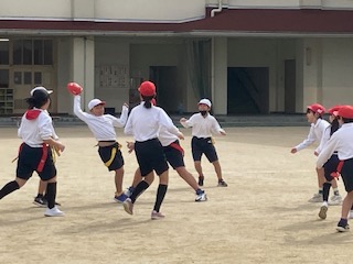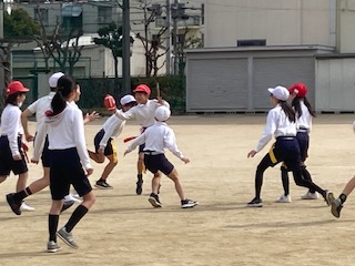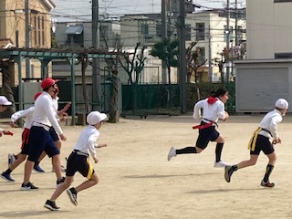 5年生の子どもたちが元気いっぱい運動場を走り回っています。腰にタグをつけてタグラグビーを楽しんでいました。オフェンスとディフェンスを交互にくり返して、タグを取られないようにボールを相手陣地まで運びます。チームで集まって作戦を話し合う場面も見られました。また女の子が負けじとパワフルに走る姿もたくさん見られ、心強く思いました。プレーとしてはまだまだのところがありますが、男女仲よくみんなで楽しんでいる様子にとても微笑ましく思いました。