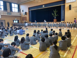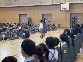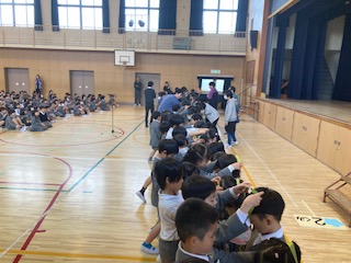 1時間目に講堂で、1年生との対面式を行いました。みんなが音楽に合わせて手拍子をする中、1年生の子どもたちが元気に笑顔で入場してきました。6年生の代表がお迎えの言葉を言ったあと、2年生の子どもたちからプレゼントを首にかけてもらいました。1年生の子どもたちは少し緊張しているようすでしたが、大きな声で『よろしくおねがいします』と言うことができました。これから困ったことがあったら、なんでもお兄さんお姉さんたちに言ってくださいね。