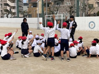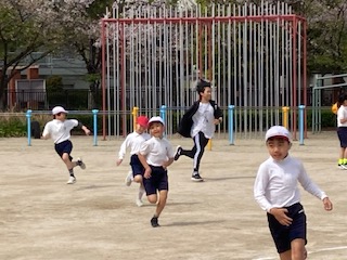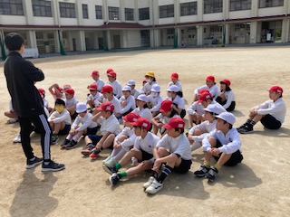 4年生になって初めての体育の授業です。[自分勝手なことをしないこと]や[みんなで協力すること]など、先生から気をつけることなどを話してもらいました。今日は楽しくみんなで遊びましょう。まずは鬼ごっこです。『鬼になりたい人!』…、先生が叫ぶと『はいっ!はいっ!はいっ!はいっ!』とたくさんの子たちが勢いよく手をあげます。鬼になりたい子も多くいるみたいです。逃げるより捕まえる方が好きなんですね。先生も全速力で追いかけます。子どもたちは先生に追いかけられることがとてもうれしそうでした。このあとドッジボールもしました。楽しく過ごすことができた4年生の子どもたちです。