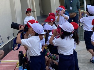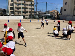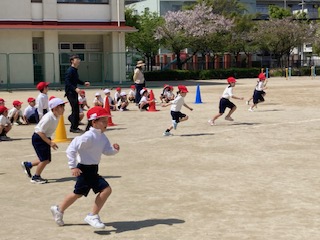 1年生の子どもたちがはじめての運動場で体育の授業です。小学校の運動場は広くて気持ちがいいですね。子どもたちのテンションも高まっています。今日は三角コーンを使ってリレー遊びをしました。上手にクルッと回ります。バトンの代わりにハイタッチです。みんな楽しんで走っていました。日差しもあったので、途中で水分補給もしました。子どもたちは水筒のお茶をおいしそうに飲んでいました。『さあ、今からもう一回走るよ!』と先生の声がかかります。
