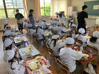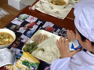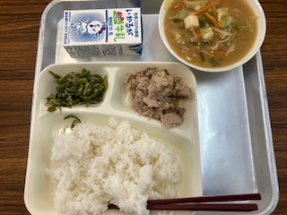 今日の給食のメニューは、豚肉の生姜焼き、豆腐のみそ汁、じゃこピーマン、牛乳、ごはんでした。豚肉の生姜焼きは生姜汁をメインに下味をつけた豚肉にたまねぎを加えて混ぜ合わせ、香ばしく焼き上げています。ごはんにピッタリの一品です。豆腐のみそ汁は豆腐の他にも細かくていねいに刻まれた野菜がたくさん入っていて、体にやさしい感じでした。じゃこピーマンはちりめんじゃことピーマンを一緒に炒めています。シンプルですが、これもごはんによく合いました。