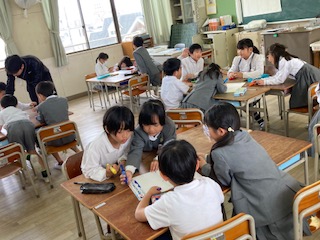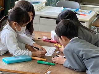 2年生の子どもたちがグループになって、何やら楽しそうに活動しています。みんなで学級の中での係(かかり)を決めました。今日はその係活動の掲示物を作っていました。マジックで係名や自分たちの名前、かわいいイラストなどをカラフルに書き加えていきます。あとで自分たちの写真も貼りつけるそうです。