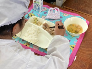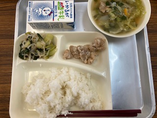 今日の給食のメニューは、鶏肉のから揚げ、中華スープ、チンゲンサイともやしの甘酢和え、牛乳、ごはんでした。鶏肉のから揚げは鶏肉に生姜汁とにんにくで下味をつけ、でん粉をまぶして風味よく油で揚げています。竜田揚げ風に仕上げていました。中華スープはしいたけの出汁がしっかりと効いていて、味に深みが感じられました。チンゲンサイともやしの甘酢和えはさっぱりとしていて、ごはんにもよく合いました。