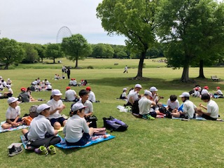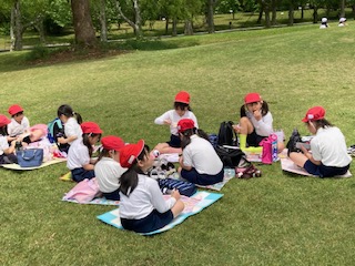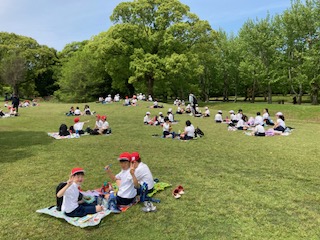 お楽しみのお弁当タイムです。広い広い芝生が広がっていて、景色も最高です。のどかでおだやかな時間がゆったりと流れています。さあ、みんなで輪になって、いただきまーす。お弁当を食べながら、大好きなおかずを入れてもらったことや、自分が持ってきたおすすめのおやつの話をしてくれる子がいっぱいいました。学校とはまた違った子どもたちの笑顔がたくさん見られます。