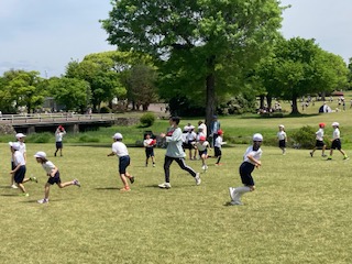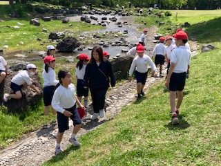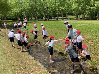 お弁当を食べたあとはフリータイムです。全力で走り回ったり生きもの探しをしたり、水遊びをしたり寝転がっておしゃべりをしたり…、過ごし方はいろいろです。『くつがぬれたーっ!』…、みんな楽しんでいます。太陽の光を浴びながら、元気いっぱいに過ごす子どもたちはキラキラ輝いて見えます。