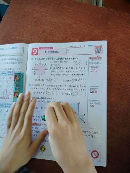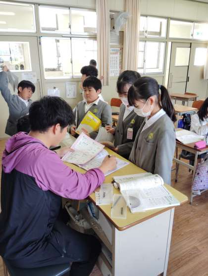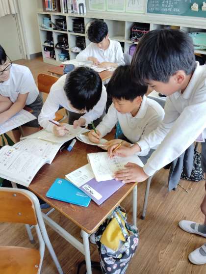 4時間目は6年生の算数です。6年生は対称な図形についての学習です。線対称や点対称な図形は定規を使い正確な作図の力が求められます。今日はまとめの学習なので、わからないところを先生に質問したり、友だちと教え合ったりしながら理解を深めていました。やっぱり仲の良い友だちには何でも聞きやすいですよね。難しい図形領域ですが、楽しそうに学習している様子にクラスの仲の良さが伝わってきました。