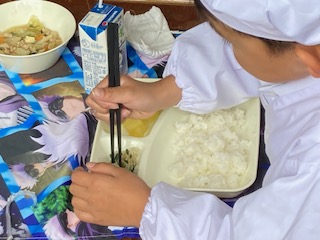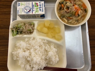 今日の給食のメニューは、中華煮、チンゲンサイともやしの生姜和え、りんご(缶)、牛乳、ごはんでした。中華煮は具だくさんで、にらの香りが効いていて、ごはんにかけると中華丼になりました。たけのこの食感が楽しめました。チンゲンサイともやしの生姜和えは薄味のさっぱりとした口あたりでおいしかったです。りんご(缶)は冷たく冷やされていて甘かったです。