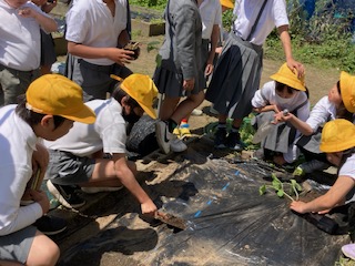 理科の学習で、4年生の子どもたちが学習園の畑にヘチマとヒョウタンの苗を植えました。グループで協力しながら植えていました。葉っぱの形やつるの巻きつき方、雄花と雌花、実の成る様子などについて、これから観察していきます。子どもたちはヒョウタンの形はすぐに思い浮かぶようでしたが、『ヘチマって何?』『ヘチマってどんな形?』と首をかしげていました。ヘチマとヒョウタンの花の色をたずねてみると『たぶん黄色』ということでした。実はヘチマが黄色でヒョウタンが白色です。定期的に雑草抜きもしないとね。