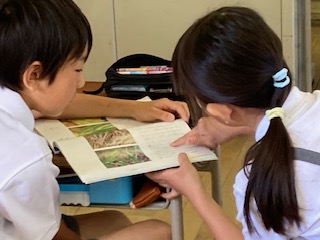 3年生の子どもたちが国語の授業で説明文[自然のかくし絵]を読んで、その謎について考えていました。昆虫は自らの保護色によって、どのように敵から身をかくしているのかという話です。たくさんの昆虫が保護色をもっています。子どもたちはそれぞれの昆虫がもつ保護色の役割を文章を読みながら探っていきます。友だちと相談したり自分の考えを積極的に伝えたりしている様子がたくさん見られました。