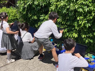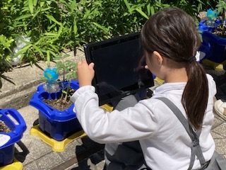 2年生の子どもたちが先週に植えたミニトマトの苗を観察していました。写真を撮って観察記録の資料として使っていきます。『はやくできないかなー』『いつできるの?』『できたらたべてもいいの?』『おいしくできるといいな!』…。子どもたちはうれしそうにミニトマトの苗を見ながら話していました。これから暑くなってくるので、土がかわかないように水やりも忘れずにやらないといけませんね。2年生の子どもたち、これから忙しくなりそうです。