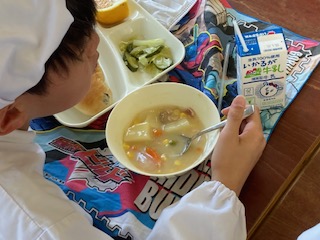 今日の給食のメニューは、鶏肉とコーンのシチュー、キャベツときゅうりのサラダ、河内ばんかん、牛乳、パンでした。鶏肉とコーンのシチューはクリーミーでまろやか、じゃがいもはホクホク、にんじんもやわらかくてとてもおいしかったです。キャベツときゅうりのサラダはワインビネガーを使った甘酸っぱいドレッシングがかけられていました。河内ばんかんは果汁が多く自然の甘さを感じました。