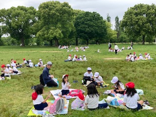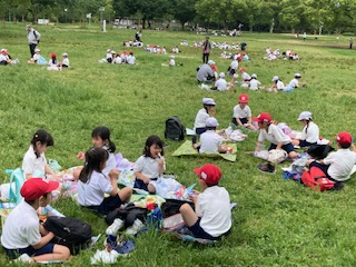 お弁当を食べる大きな芝生広場にやって来ました。今からお弁当タイムです。『おなかすいたー!』…、子どもたちももうお腹ぺこぺこみたいです。先生からのお話を聞きます。今日は1年生と2年生が一緒のグループになって食べます。2年生の班長さんが『手をあわせて、おいしいお弁当いただきます!』と声をかけます。そしてみんなで『いただきます!』と返していました。1年生と2年生がとても仲良くなっていました。みんな口の中を大きくふくらませて、おいしいの笑顔です。