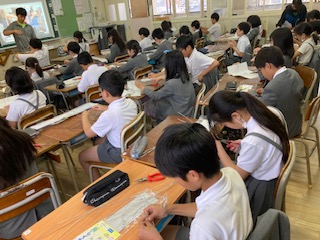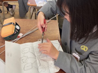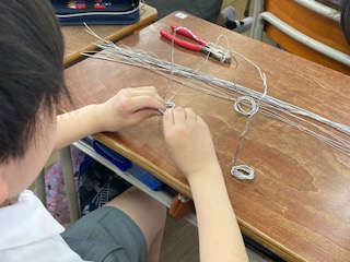 5年生の子どもたちがはり金とペンチを手に持って、何やら難しい顔をしています。図工の学習で[はり金工作]に取り組んでいます。細長いはり金も形を変えたり組み合わせたりすると、立たせたり立体感を出したりすることができます。子どもたちがいろいろと創意工夫しながら、おもしろいと思ったり美しいと感じたりする形を作り出していくのがねらいです。どんな作品ができるのか楽しみです。先生も思わず子どもたちと一緒に夢中になって手を動かしていました。