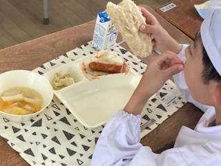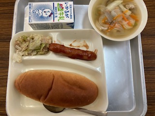 今日の給食のメニューは、ウインナーのケチャップソース、スープ、焼きツナキャベツ、牛乳、パンでした。ウインナーのケチャップソースはウインナーがまあまあ大きくて食べ応えがありました。かじると皮がパリッとはじけて肉汁が出てきます。スープはチキンスープをベースに塩こしょうなどで味をととのえてあり、鶏肉とじゃがいも、にんじん、たまねぎ、しめじ、グリンピースが入っていました。焼きツナキャベツは今までにもありそうなメニューでしたが、焼き物機で焼き上げる新メニューです。