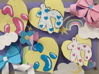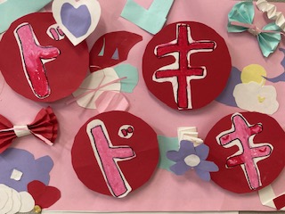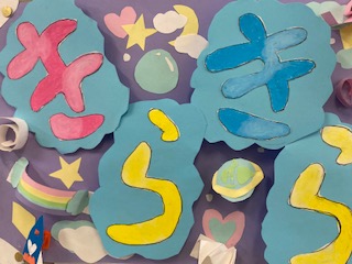 6年生の教室の後ろに子どもたちの図工の作品が掲示してありました。その言葉のイメージを表すように工夫しています。色画用紙を切り貼りして組み合わせたり、小物を作って飾りをつけたり、立体にして揺れるようにしたりしていました。この他にもワクワク、ぴかぴか、うほうほ、ベリベリ、ハピハピ、メラメラ、ピヨピヨ…などいろいろあって、子どもたちの世界観が広がっています。