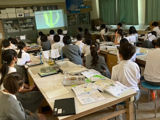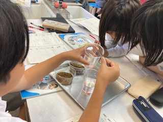 今、5年生は教室で種子が発芽する様子について観察を続けています。種子の発芽にはどんな条件が必要なのだろうか。水?土?日光?空気?…、いろいろ条件を変えながら観察しているところです。でも時間がかかってしまうので、今日は理科室で映像においても確認していくことにします。映像から子どもたちは種子には発芽するために必要な養分が含まれていることを知りました。そしてヨウ素液を使って養分を調べることもできました。