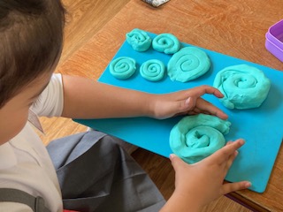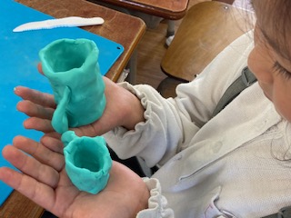 1年生の子どもたちがみんなで楽しく、ねんどあそびをしていました。『せんせい、みてみてー』『じょうずでしょ』『くるくるまあるくしてみた』『コップをつくったよ』『なにかわからなくなっちゃった』…。教室に入ると、たくさんの子どもたちが声をかけてくれました。子どもたちは頭の中でいろいろと考えたものを作っては、つぶしてまた次のものを作り始めます。何度もくり返します。手先を上手に使ってねんどをこねたりちぎったり、のばしたりくっつけたりしながら、できた作品を先生や友だちに見せては喜んでいました。