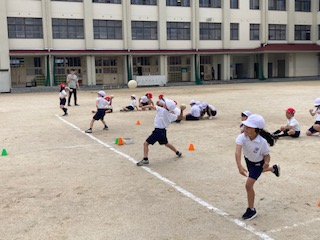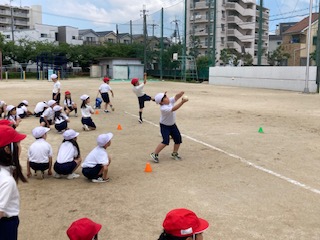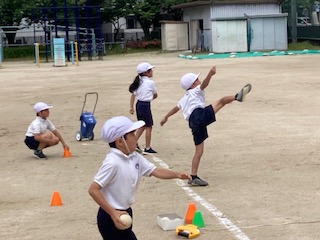今は体力テストの時期なので、どの学年もいろいろな種目の測定を行っています。今日の放課後にはソフトボール投げのラインを先生たちが引く予定です。それに向けて2年生の子どもたちがソフトボール投げの練習をしていました。でもソフトボールは普段投げることがあまりないので、スムーズに投げられなかったり目の前にボールをたたきつけてしまったりしてしまいます。それでも何度か投げているうちに、何となくコツをつかんできた子も出てきました。友だちが投げるときに『がんばれー』と自然に声をかけている姿がかわいらしい2年生の子どもたちです。