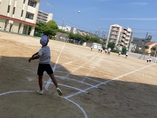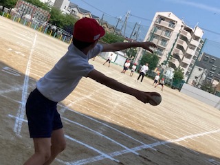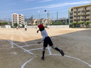 運動場から4年生の子どもたちの歓声が聞こえてきました。ソフトボール投げの記録を測っています。友だちが投げるたびに『おーっ!』とか『すごいっ!』とか『がんばれー』とか…、いろんな歓声があがります。足のステップも生かしながら勢いよく投げていきます。中には全然違う方向に投げてしまった子もいて、恥ずかしそうに照れている顔がかわいかったです。4年生の最高記録は39mでした。みんな頑張って投げていました。