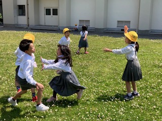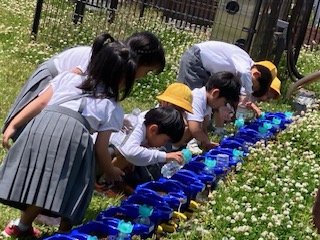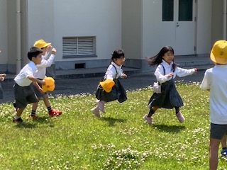 休み時間になると、1年生の子どもたちが芝生広場にやってきます。子どもたちは早くも芝生広場が大好きになっています。だって気持ちがいいですもんね。しかも今日はぽかぽか陽気で、陽だまりとなっています。おにごっこをしながら笑顔で走り回っている1年生の子どもたち、輝いて見えますね。そのすぐ隣りでは同じく1年生の子どもたちが先週に植えたアサガオの種に水をあげています。もう芽が出ている植木鉢もいくつかあって、子どもたちがうれしそうに報告に来てくれました。