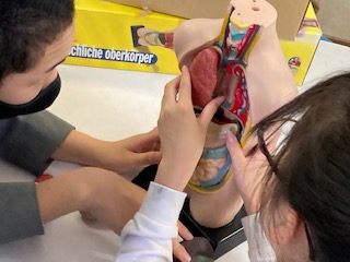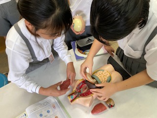 ヒトの体の中にはさまざまな臓器があります。体の中の臓器は血液によって互いに関わり合いながらはたらいていて、生命を支えています。心臓、肺、肝臓、腎臓、胃、小腸、大腸…、6年生の子どもたちが理科室で人体模型を使って、臓器の名前や位置などについて確認していました。子どもたちは興味深く先生の説明を聞いたり、元の位置に臓器をはめ込んだりしていました。それぞれの臓器のはたらきについてもこれから学んでいきます。
