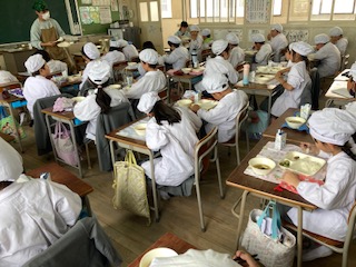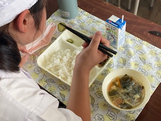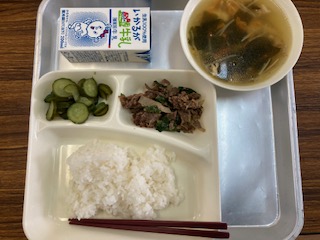 今日の給食のメニューは、プルコギ、豆腐とわかめのスープ、きゅうりの甘酢漬け、牛乳、ごはんでした。プルコギは牛肉に生姜汁とコチジャン、にんにく、すりごまなどで下味をつけて、たまねぎとにらを混ぜ合わせて焼いています。豆腐とわかめのスープは豚骨スープをベースにしていて、豆腐以外にも具材がたくさん入っていました。きゅうりの甘酢漬けはあっさりとした口あたりでした。プルコギは韓国・朝鮮の料理で[プル]は火、[コギ]は肉という意味で、合わせて[火で焼いた肉]という意味になります。日本の焼肉とは違い、醤油や砂糖、ハチミツなどで味つけをし、専用の鍋で作る[すき焼き]に近い料理だそうです。