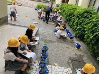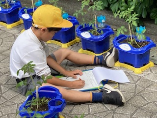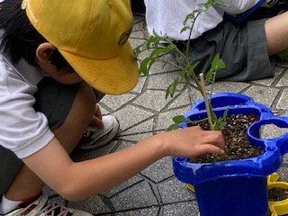 2年生の子どもたちが今日もミニトマトの観察をしています。本当に生長が早いので、その分発見も多いです。葉っぱの形や大きさ、枚数、触った感じ、葉っぱの生え方や茎の枝分かれの仕方、根っこの辺りの様子、前回の観察から伸びた長さなど、子どもたちはいろいろな部分にしっかりと視点をもって自分のミニトマトを見つめていました。そしてスケッチしたり文章で書き表したり頑張っていました。きっと小さな実ができ始めたときには大騒ぎになりそうですね。
