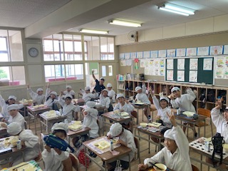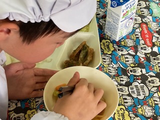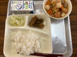今日の給食のメニューは、ちくわの磯辺揚げ、厚揚げと里芋のみそ煮、あっさりキャベツ、牛乳、ごはんでした。ちくわの磯辺揚げはちくわに青のりを加えた衣をつけてなたね油で揚げています。磯の香りを感じました。厚揚げと里芋のみそ煮は厚揚げと里芋以外にも具だくさんで、赤みそをベースに味つけしていて、ごはんにもよく合いました。あっさりキャベツはシンプルな塩味です。