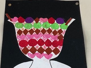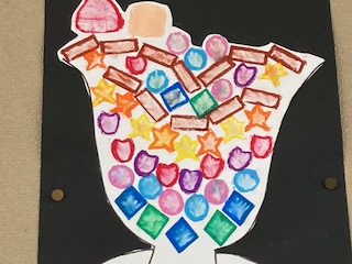 『すてきなパフェ』、2年生の作品です。子どもたち一人一人が最後までていねいに取り組んで作った様子が伝わってきます。どれもカラフルで美味しそうです。パフェグラスの中には子どもたちのたくさんの夢が詰まっています。教室の後ろがまるでレストランのショーウィンドウのようになっていて、とてもにぎやかです。どのパフェにしようかな…、迷ってしまいますね。