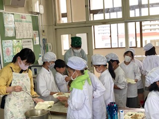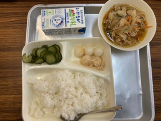 今日の給食のメニューは、豚丼、きゅうりの梅風味、白玉だんご、牛乳でした。豚丼は豚肉だけでなくたまねぎや糸こんにゃくにもしっかりと出汁がしみていて、子どもたちも大好きなメニューです。きゅうりの梅風味はきゅうりを梅肉と米酢などで作ったドレッシングで和えています。白玉だんごはモチモチしていて、きな粉をかけて食べました。