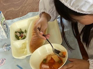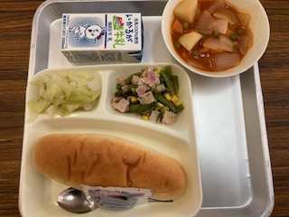 今日の給食のメニューは、ケチャップ煮、ベーコンと三度豆のソテー、キャベツのバジル風味サラダ、牛乳、パンでした。ケチャップ煮はケチャップのトマト味やさわやかな酸味がアクセントになっていて、野菜もたくさん入っていました。ベーコンと三度豆のソテーは塩こしょうのシンプルな味つけでしたが、三度豆の甘みが感じられました。キャベツのバジル風味サラダはバジルを使った手作りのドレッシングがかけられています。