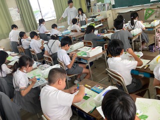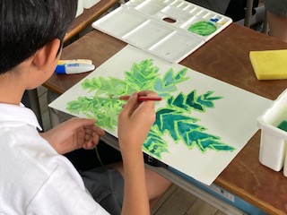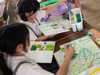 4年生の子どもたちが、アジサイの絵を描くようです。今日は葉の部分を仕上げていきます。絵の具に少しずつ水を足して微妙な色の変化が表れるように工夫していきます。このあと花びらを付け足していくのですが、花びらは別の画用紙で作っているようです。アジサイの淡い色が表現できるといいですね。手でちぎるのかな?それとも切り貼りするのかな?いずれにしても梅雨の季節感が十分に感じれる教室になりそうです。