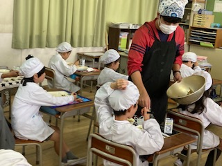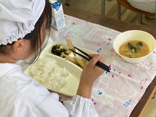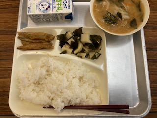 今日の給食のメニューは、きびなご天ぷら、みそ汁、わかたけ煮、牛乳、ごはんでした。きびなご天ぷらは甘めの醤油ベースのたれがかかっていました。きびなごは10cmくらいの小さな魚で、あたたかい海を好み、春から初夏にかけて卵を産むために日本の海岸近くにやってきます。この時期のきびなごは脂がのっていておいしいです。みそ汁は鶏肉、キャベツ、たまねぎ、にんじん、こまつなが入っていました。わかたけ煮は和風の上品な味つけでした。春に収穫されるたけのことわかめは[春先の出会いもの]と言われ、煮ものや汁ものによく組み合わされます。