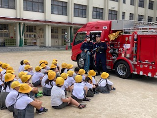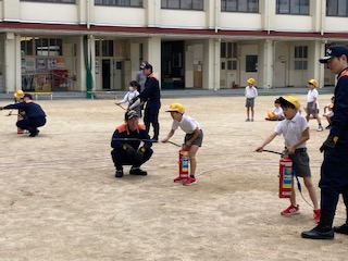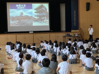 2時間目には各学年の実態に合わせた内容で防災学習を行いました。東淀川区役所や東淀川消防署と連携しています。ビデオによる学習(1年)、消防車の紹介や隊員の仕事、水消化器体験(2.3年)、能登半島地震の被害状況や避難生活の様子、防災意識の向上(4.5.6年)など多岐にわたっています。子どもたちは関心をもって真剣な表情で説明を聞いていました。