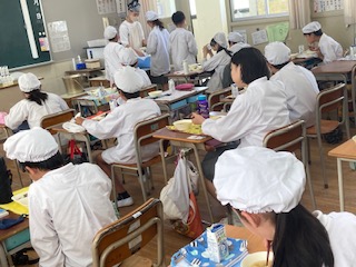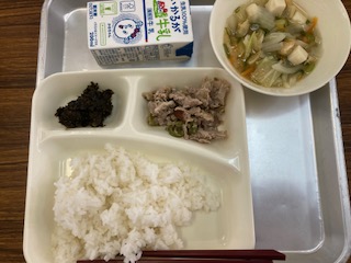 今日の給食のメニューは豚肉の梅風味焼き、五目汁、のりの佃煮、牛乳、ごはんでした。豚肉の梅風味焼きは下味に梅肉を使っているのでちょっと和風感が出ていました。五目汁は出汁がしっかりととられていて、味に深みが感じられました。具材にはとうふ、うすあげ、たまねぎ、キャベツ、にんじん、青ねぎを使っています。のりの佃煮は砂糖と醤油、出汁、しいたけを煮て、かつおぶしときざみのりを加えてさらに煮つめています。ごはんによく合います。