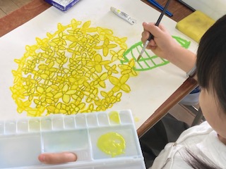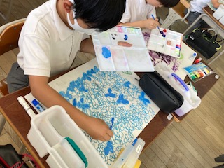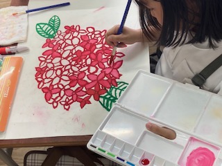 3年生の子どもたちが図工の作品づくりで、アジサイの花びらの色をぬっていました。いろんな色のアジサイがありました。色の選択は子どもたちの自由です。下描きをしてから花びらを一枚一枚ぬっていくのですが、条件がありました。それはとなりどおしの花びらが同じ色にならないようにすることです。絵のぐに水を加えて色を薄めたり、白色の絵のぐを足して微妙に色を変化させたりしていきます。でも自分では調節したつもりでも実際にぬってみるとあまり変わってなかったってこともあるみたいです。集中して黙々と作業を続ける3年生の子どもたちでした。