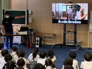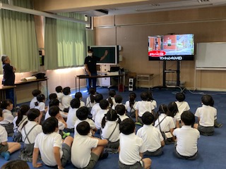 2時間目に東淀川区役所と連携して、3年生の子どもたちに[安全安心教室]を行いました。マンションのエレベーターや家での1人のときの過ごし方など、普段の生活の中に潜んでいる危険について警戒しなければならないことを教えてもらいました。子どもたちは映像を見ている中で危ない場面が出てくると、『あー危ない!』『ドアを開けたらあかんー!』などの声が自然と出ていました。自ら危険を察知して安全な行動ができるようになってほしいです。防犯パトロールカーも見回り活動をしてくれています。