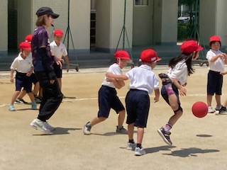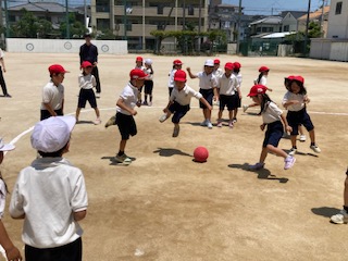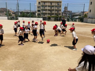 運動場に1年生の子どもたちの楽しそうな声が響きわたっています。体育の授業で[ころがしドッジボール]をしていました。ボールを転がすので誰でも楽しめます。簡単で盛り上がります。くるくる回りながら逃げ回って、ときには大きくジャンプしてボールを飛び越えます。上手によけることができたときの顔はとってもにこにこ笑顔です。いっぱい動いたから、きっと給食もおいしくたくさん食べられそうですね。