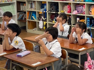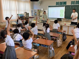 1年生の子どもたちがマイケル先生と楽しくミッシングゲームをして盛り上がっています。ミッシングゲームとは黒板に絵カードなどを貼っておき、子どもたちに目を伏せさせている間にカードを隠して、そのカードを当てさせるゲームです。今日は数字を使っていました。