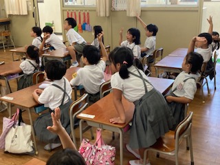 子どもたちは一斉に『はいっ!はいっ!はいっ!はいっ!』と手をあげて叫びます。隠された数字を英語で答えます。