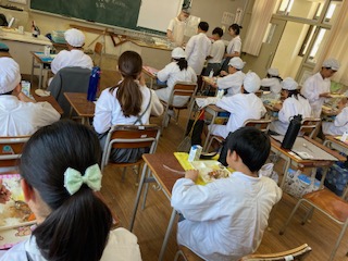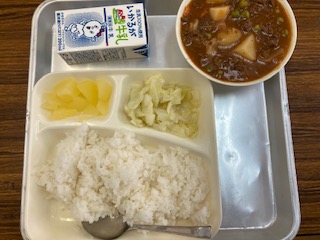 今日の給食のメニューは、ハヤシライス、キャベツのゆずドレッシング、りんご(缶)、牛乳でした。ハヤシライスは牛肉の旨みがしっかりと味わうことができ、まろやかなルウに仕上がっていました。野菜もたっぷりで子どもたちもおいしそうに食べていました。キャベツのゆずドレッシングはゆず果汁を使ったドレッシングを手作りしています。りんご(缶)は冷えていて甘かったです。