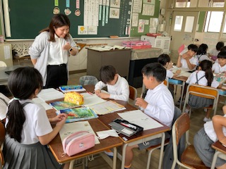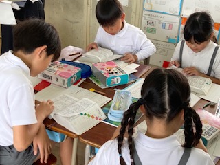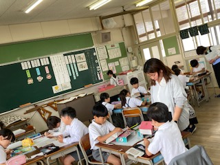 3年生の国語の授業です。[ぽつぽつ][ざあざあ][しとしと]は雨が降る様子を表しています。他にも[ぱらぱら][さっと][ざんざん]などもあるかもしれません。いったい雨の降り方にどんな違いがあるのでしょうか。子どもたちはその違いの様子について想像したことを思い思いに発表し合っていました。国語辞典を使って意味も調べてみます。次はグループで他の言葉を使って文作りにも挑戦です。ただ文を作るだけではなく、その様子についてもちゃんと様子の説明をつけ加えないといけません。子どもたちのみんなで主体的に学習する様子に心が和みます。