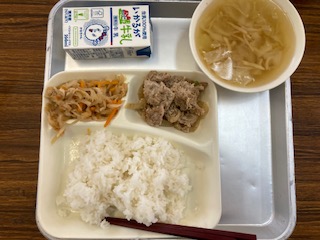 今日の給食のメニューは、豚肉のごまみそ焼き、すまし汁、切り干し大根の炒め煮、牛乳、ごはんでした。豚肉のごまみそ焼きは豚肉にねりごまと赤みそで下味をつけて、たまねぎとピーマンを混ぜ合わせて風味よく焼き上げています。ごはんとの相性はばっちりです。すまし汁は味に深みが感じられ、鶏肉とキャベツ、たけのこ、えのきが入っていました。切り干し大根の炒め煮はだしがしっかりとしみ込んでいておいしかったです。