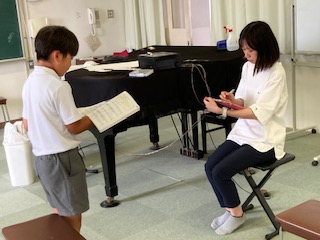 5年生の子どもたちが図工の作品制作で絵画に取り組んでいました。何を描いているのか尋ねてみると、ホタルを登場させた絵を描くそうです。[夜空の月明かりに揺れる花の間を飛び交うホタル]とでもいうのでしょうか。とにかく幻想的な感じの作品になりそうです。まだまだ下描き段階なので完成が楽しみです。…その裏では…、一人ずつ呼び出されて音楽の歌のテストです。先生と向かい合って、これはこれで緊張しそうですね。歌い終わると、ホッとした表情で作品制作の続きにかかる子どもたちでした。