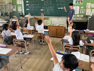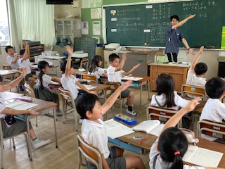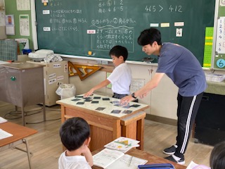 2年生の算数で[数の大小]の学習です。例えば、398と412、463と469ではどちらが大きいですかという問題です。まず一番大きい百の位の数字を比べて、同じだったら次に大きい十の位の数字を比べます。それでも同じだったら一の位の数字を比べます。数の大小を表す > と< の記号も教えてもらいました。でも不等号という名称はまだです。だから腕を使って『こっち向き』『あっち向き』といった感じです。先生と対決するカードゲームもしました。楽しみながら勉強する2年生の子どもたちでした。