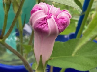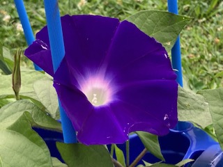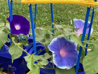 1年生の子どもたちがいつも気にかけているアサガオの花が咲き始めました。まだ1年生49個の植木鉢のうち3個なのですが、他の植木鉢のアサガオも葉っぱが青々としていて、ツルも立派に伸びてきているので、これから順番にどんどん咲いていくと思います。紫紺(しこん:紫がかった紺色、紺色っぽい紫色)のアサガオがあまりにもあざやかで高貴な感じなのでびっくりしました。きっと子どもたちは自分のアサガオが早く咲いてくれることを、今か今かと待ち望んでいることだと思います。