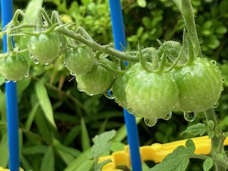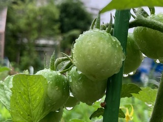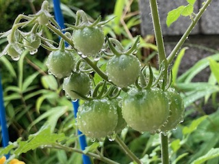 2年生の子どもたちが大事に育てている植木鉢のミニトマトが雨つゆを浴びて、さらにみずみずしさをかもし出しています。落ちそうで落ちない透明感ばっちりのしずくに、ガラスのようにまわりの景色が映り込みます。尊い生命の息吹のようなものを感じました。ごめんなさい、ちょっと大げさでした。(>_<) でもこういう瞬間を誰にも知らせてもらわずに、子どもたち自身が偶然見つけてほしいなと思いました。でも雨だから今日は見に来ないかな…ん〜残念。