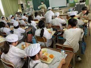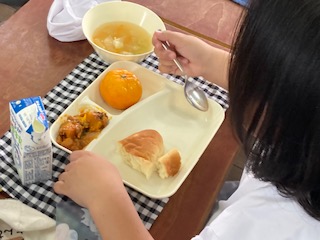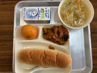 今日の給食のメニューは、かぼちゃのミートグラタン、鶏肉と野菜のスープ、冷凍みかん、牛乳、パンでした。かぼちゃのミートグラタンは牛豚ひき肉の旨みとかぼちゃの甘さを生かした一品で、子どもたちも大好きです。鶏肉と野菜のスープはチキンブイヨンをベースに味つけしてあり、鶏肉をメインにじゃがいも、にんじん、キャベツ、グリンピースが入っていました。冷凍みかんは歯ぐきにしみました。冷凍みかんって家庭ではしないのになぜか給食では出てきます。