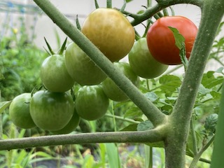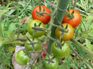 なかよし学級のお友だちが学習園で育てているミニトマトがぷりぷりの実をつけて、少しずつ色づき始めています。一つの房に10個近くの実を連ねています。茎に近いものから順に赤く染まっていきます。今はまだ先頭のリーダーさんだけです。『はらぺこあおむし』という絵本を知っていますか。園児や低学年の子どもたちが大好きな絵本です。まるでそのはらぺこあおむしのように見えませんか。なかよし学級のお友だちもこれを見て『はらぺこあおむしみたいだね』って言わないかな。