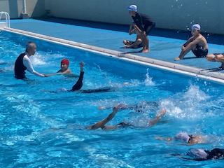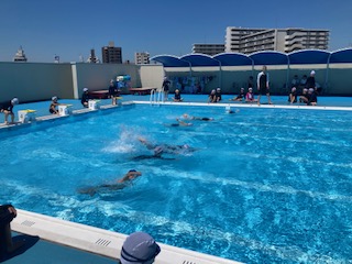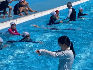 青い空とキラキラ光る水、今日は絶好のプール日和です。そんな中、4年生の子どもたちが元気に泳いでいます。蹴伸びからばた足へ、そしてクロールの順番に練習していきます。プールをたてに泳いで記録も測りました。4年生ではまだまだ息継ぎやフォームが定まらず、スムーズな泳ぎができない子たちがたくさんいます。もちろん練習を重ねないと上達はしないのですが、まずは嫌がらずに、水の中に入って気持ちいいという思いを持続させることが大事です。4年生の子どもたちを見ていると、みんな楽しそうに活動していました。だからきっとみんな心配しなくても上手に泳げるようになると思います。